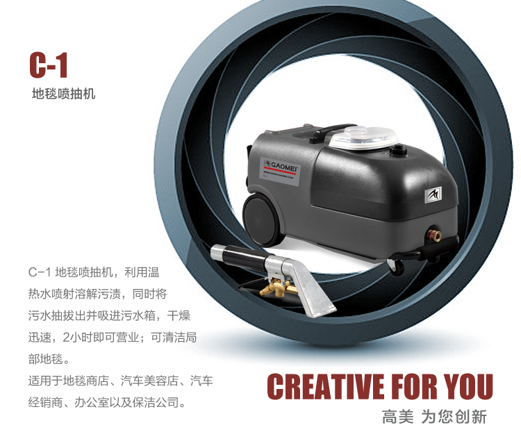 C1地毯喷抽机,利用温热水喷射溶解污渍,同时将污水抽拔出并吸进污水箱,干燥2小时即可营业;可清洁中等面积地毯。