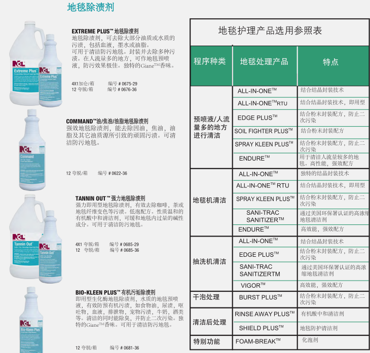 由NCL提供成熟配方产品的地毯护理解决方案,可以延长地毯的使用寿命,维护地毯的靓丽色彩,提供使用者满意的环境氛围和舒适度。NCL提供的全方面的地毯护理产品包括清洁剂、除渍剂、地毯防护剂及其它的配套产品,让使用者在维护地毯时可以轻易的使用产品,并有效控制成本。特别是我们的ECT™和EPT™粉末结晶封装技术的防再次污染配方的地毯清洁剂将污垢包裹成一个松脆的、不粘的粉末残渣,通过常规的真空吸尘器很容易去除。使地毯更加美丽干净。其结果是延长了地毯清洗间隔时间,延长了地毯保持干净的时间。