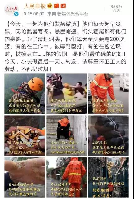 【今天,一起为他们发条微博】他们每天起早贪黑,无论酷暑寒冬。悬崖峭壁,街头巷尾都有他们的身影。为了清理烟头,他们每天至少要弯200次腰;有的在工作中,被辱骂殴打;有的在捡垃圾时,被撞身亡……你的假期,是他们最忙碌的时刻!放假期间转发,请尊重环卫工人的劳动,不乱扔垃圾!